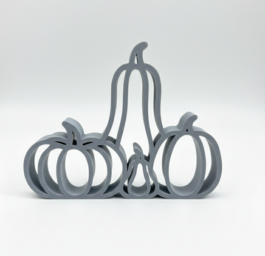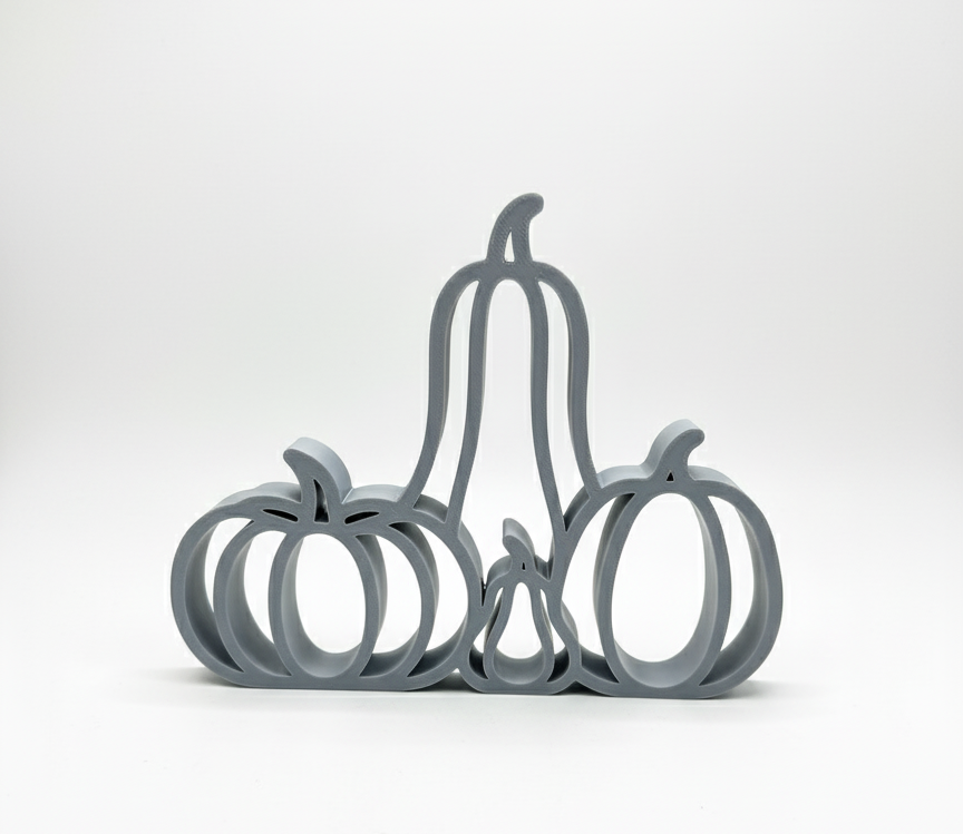 Crafted using precision 3D printing technology and durable, eco-friendly PLA material, this sculpture offers an architectural take on the classic pumpkin patch. The clean, open outline features a cluster of four distinct gourds and pumpkins, creating a multi-dimensional shadow effect and a subtle focal point on any surface.